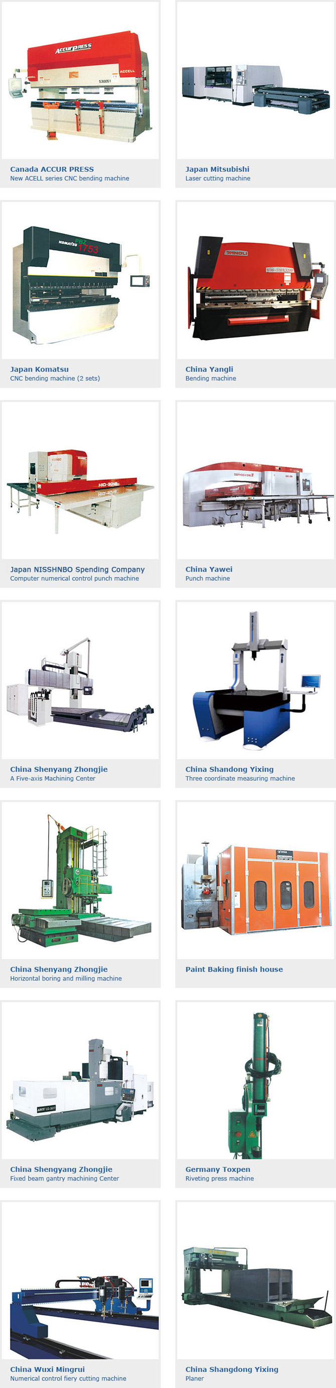 公司為適應(yīng)市場對“小批量,多品種,質(zhì)量要求高,交貨期短,更新頻繁”鈑金零部件加工要求,引進(jìn)日本三菱大功率激光切割機(jī),日本NISSHINBO高速電腦轉(zhuǎn)塔數(shù)控沖床,加拿大ACCURPRESS/日本KOMATSU數(shù)控折彎機(jī),日本OTC焊接設(shè)備等設(shè)備,固定資產(chǎn)投資達(dá)2000多萬元,這些設(shè)備有以下特征: